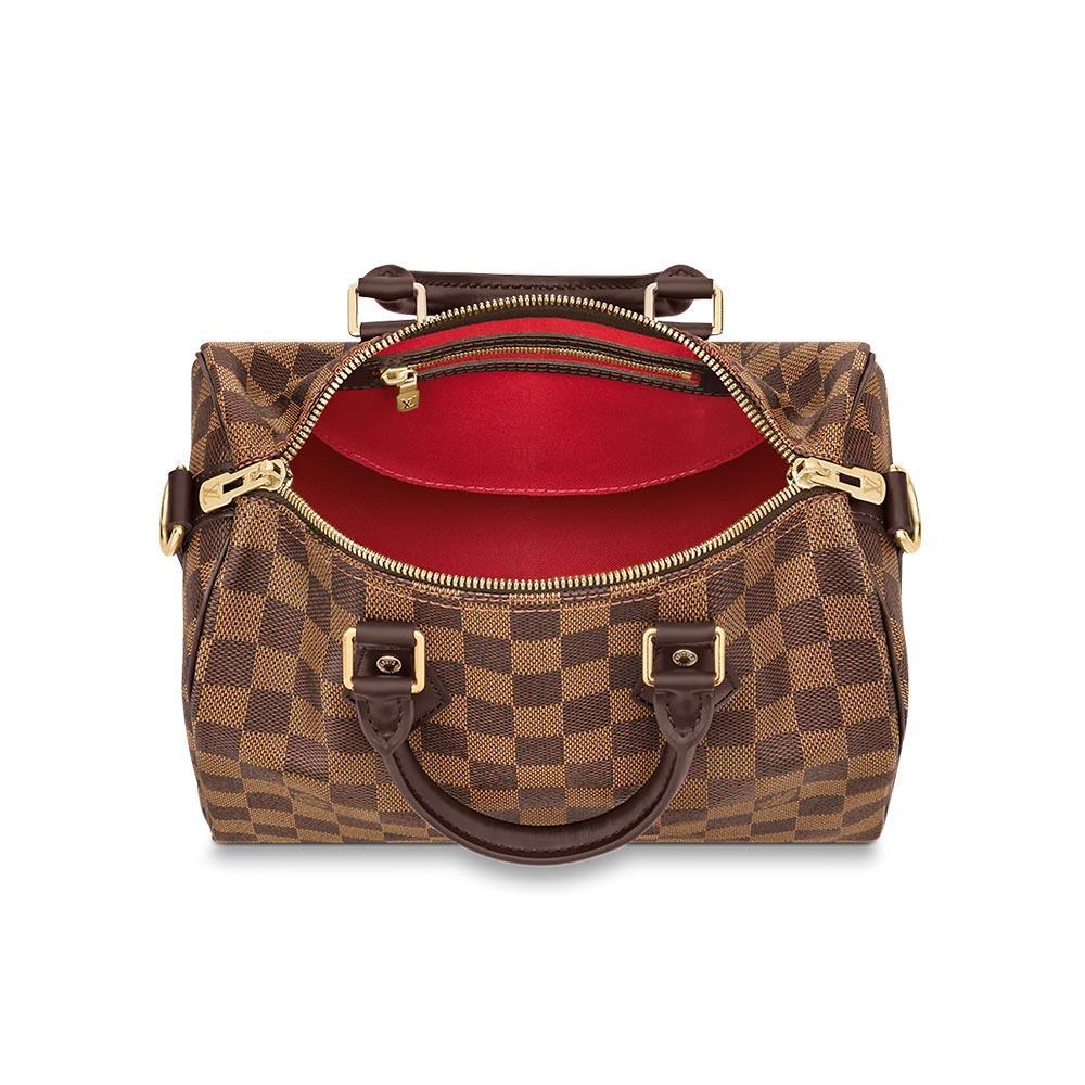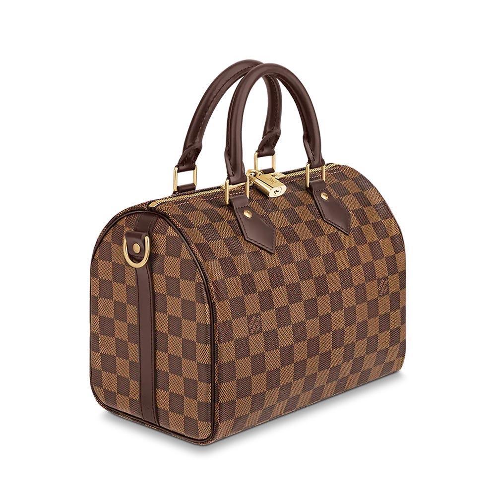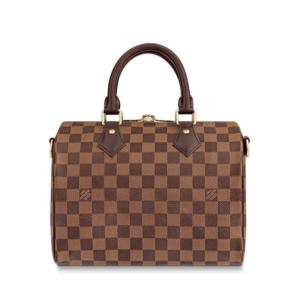 The Speedy Bandoulière 25 in graphic Damier Ebène canvas is an ideal city bag for every day. Originally created for travellers in the 1930s – the name refers to the era’s rapid transit – every feature of the Speedy’s design is iconic, from its unmistakable shape to the rolled leather handles, engraved padlock and detachable strap.