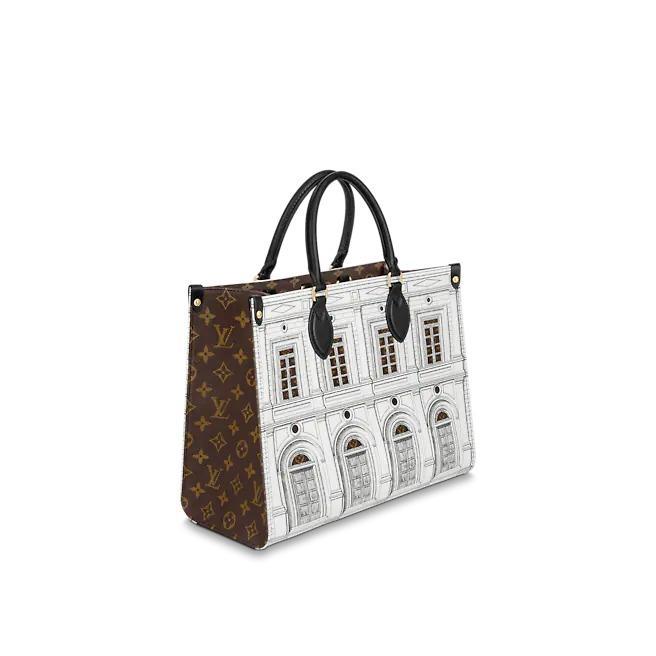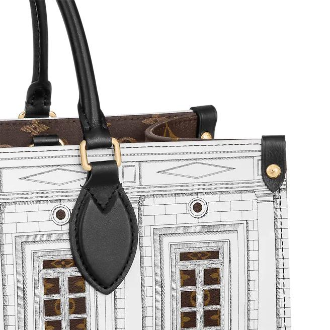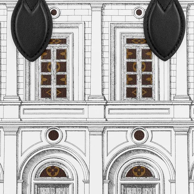 Part of the season’s LV xFornasetti capsule, this striking OnTheGo MM Architettura tote is crafted from printed matte calfskin, with Monogram canvas trim. The smooth leather mimics stone, upon which imaginary buildings are drawn in the signature Fornasetti manner. Fashion and function combine in this roomy carryall, ideal for office or city wear.