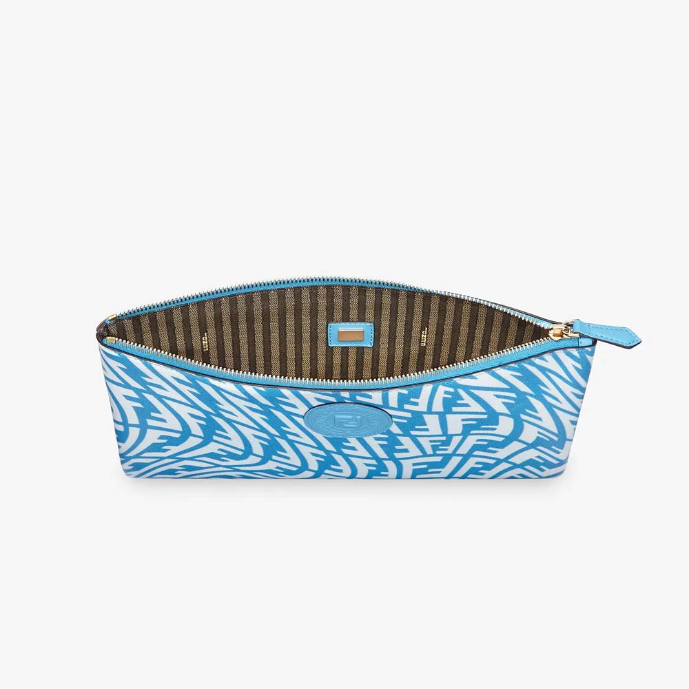Pouch with zip closure. Made of coated canvas with a light blue and white FF Vertigo motif. Interior trimmed with Pequin pattern. Gold-finish metalware.