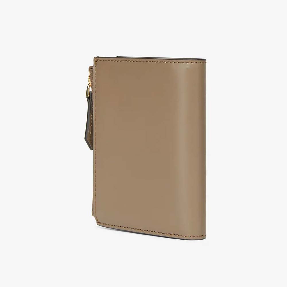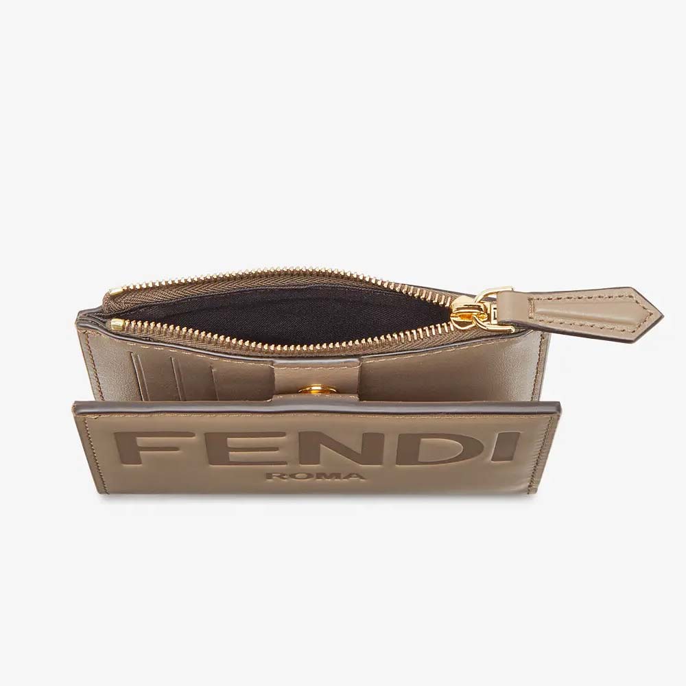 Compact Fendi Roma wallet, with large internal compartment for banknotes, six card holder pockets and an external coin purse with zip. Press stud fastening. Made of grey leather. Embellished with Fendi Roma lettering print. Gold-finish metalware.