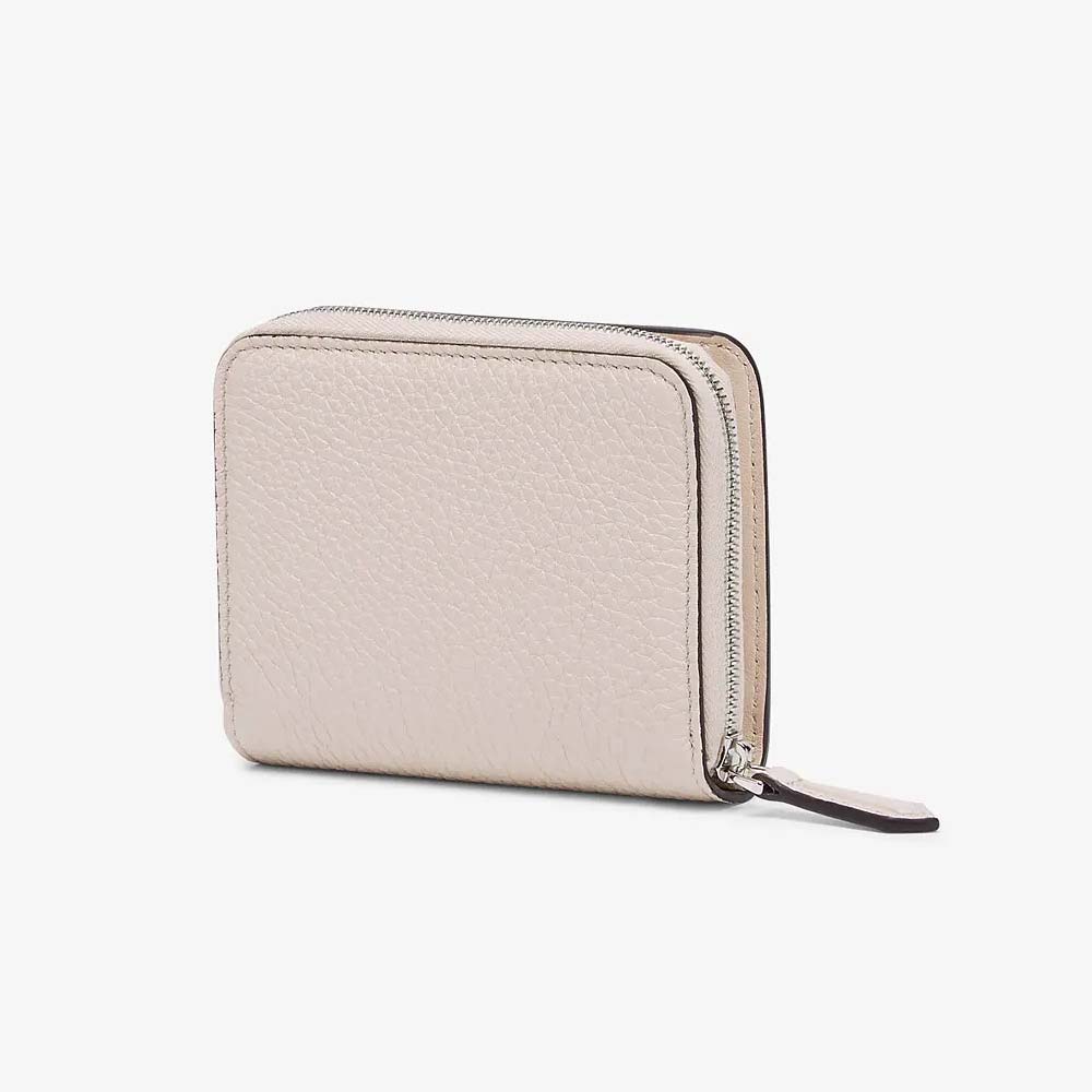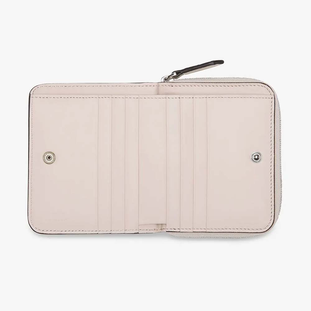 Compact Peekaboo Selleria bi-fold wallet. Interior organised with a banknote compartment and eight cardholder slots. Features external coin purse compartment with zip closure on three sides. Made of white Cuoio Romano leather. Palladium-finish metalware.