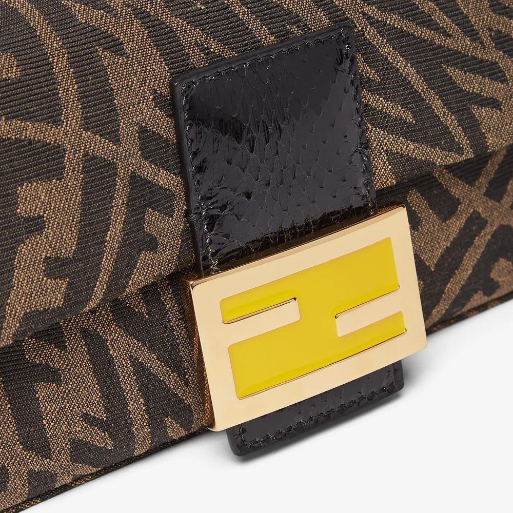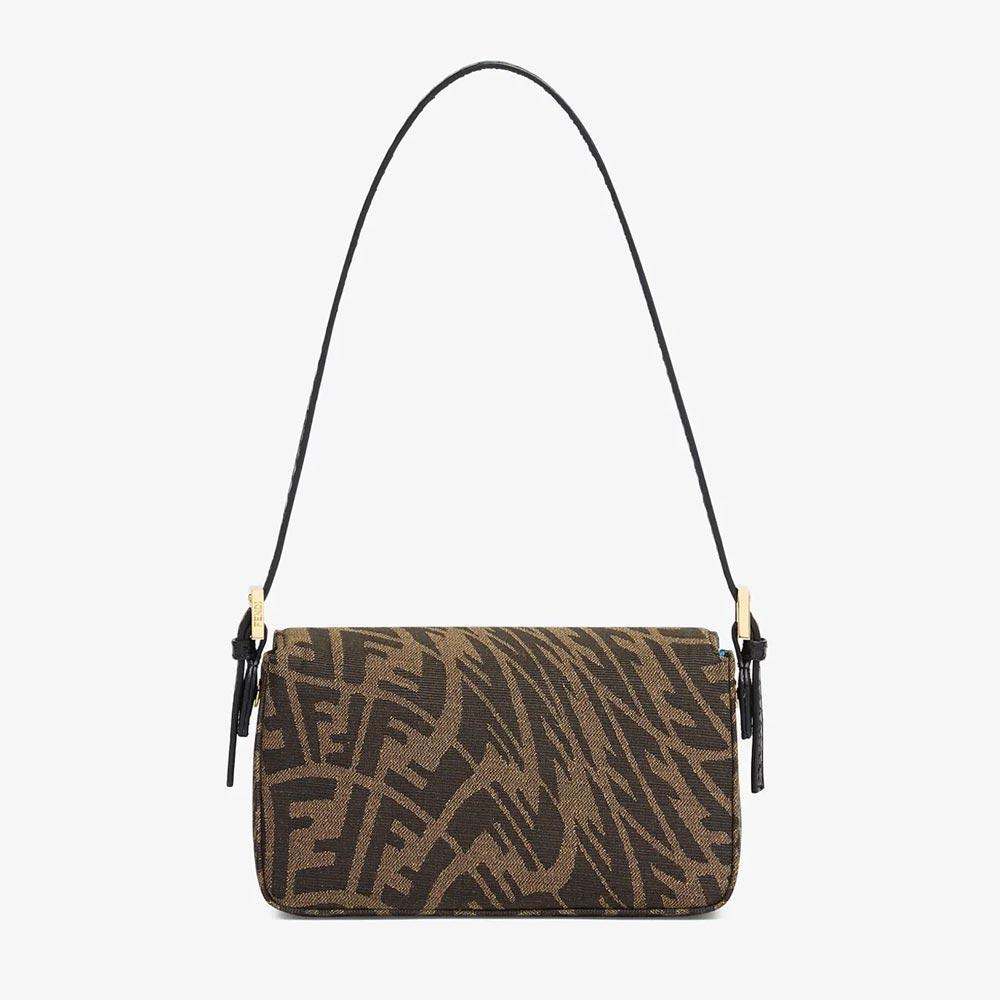 Small Baguette 1997 bag made of jacquard fabric with an FF Vertigo graphic motif in brown, decorated with an FF clasp.