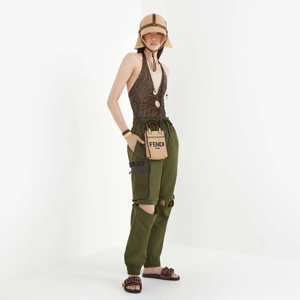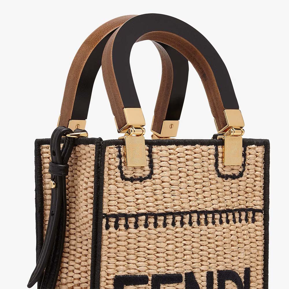 Mini Sunshine Shopper bag made of natural coloured straw with FENDI ROMA embroidery and stiff black patent leather handles.