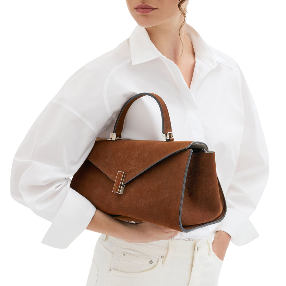 Accented with hand-painted black Costa edging and the signature Iside twist-lock clasp, this top-handle bag embodies modern craftsmanship and timeless sophistication.