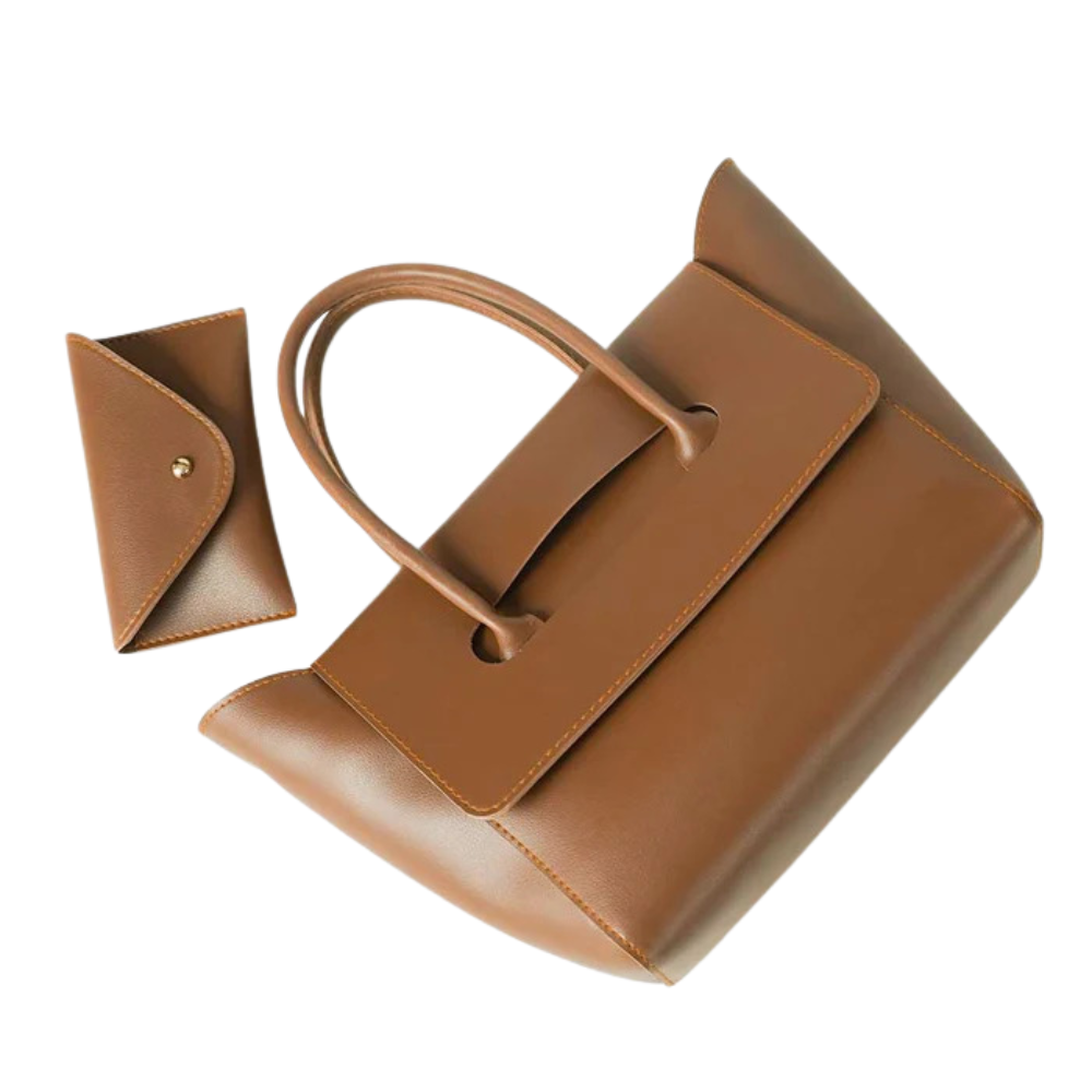 This handbag comes in a structured tote style with a smooth brown finish, designed for both style and practicality. It includes a matching pouch that can be used for cards, coins, or small accessories, making it a functional two-piece set. The bag features dual top handles for comfortable carrying and a spacious interior to hold everyday essentials such as a wallet, phone, keys, and makeup. With its minimalist design and versatile color, this handbag is suitable for office, shopping, travel, and casual outings.