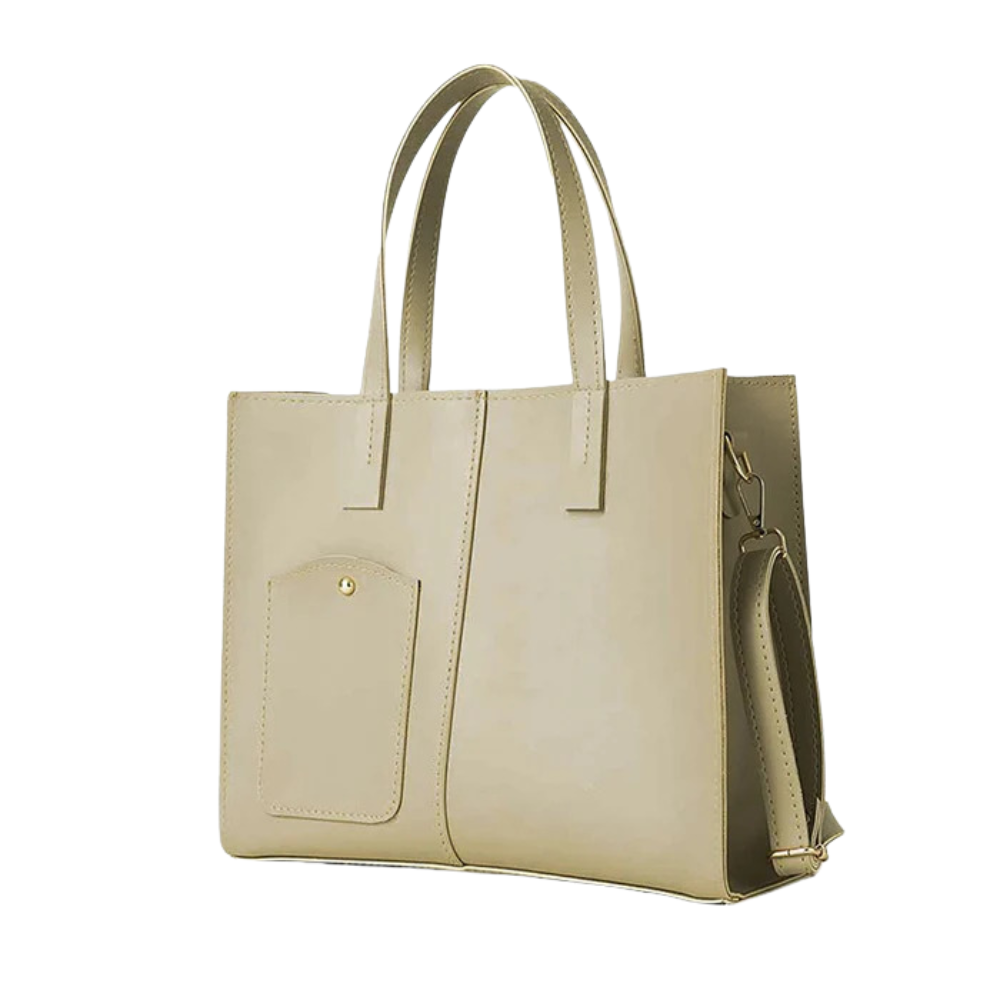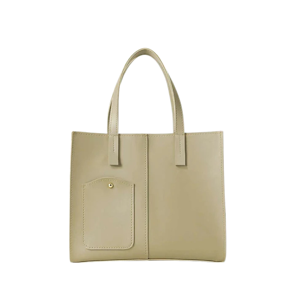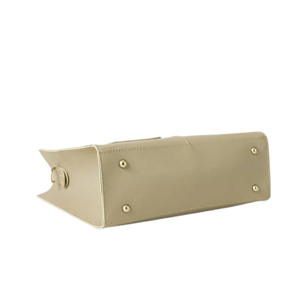 This tote-style handbag is designed with a structured rectangular silhouette and a smooth beige finish. The front features a stitched pocket detail with a button accent, adding a minimal yet stylish touch. Dual top handles make it comfortable for hand carry, while the spacious interior provides room for essentials such as a wallet, phone, makeup items, and small accessories. The clean and versatile design makes this handbag suitable for office, shopping, travel, and everyday outings.