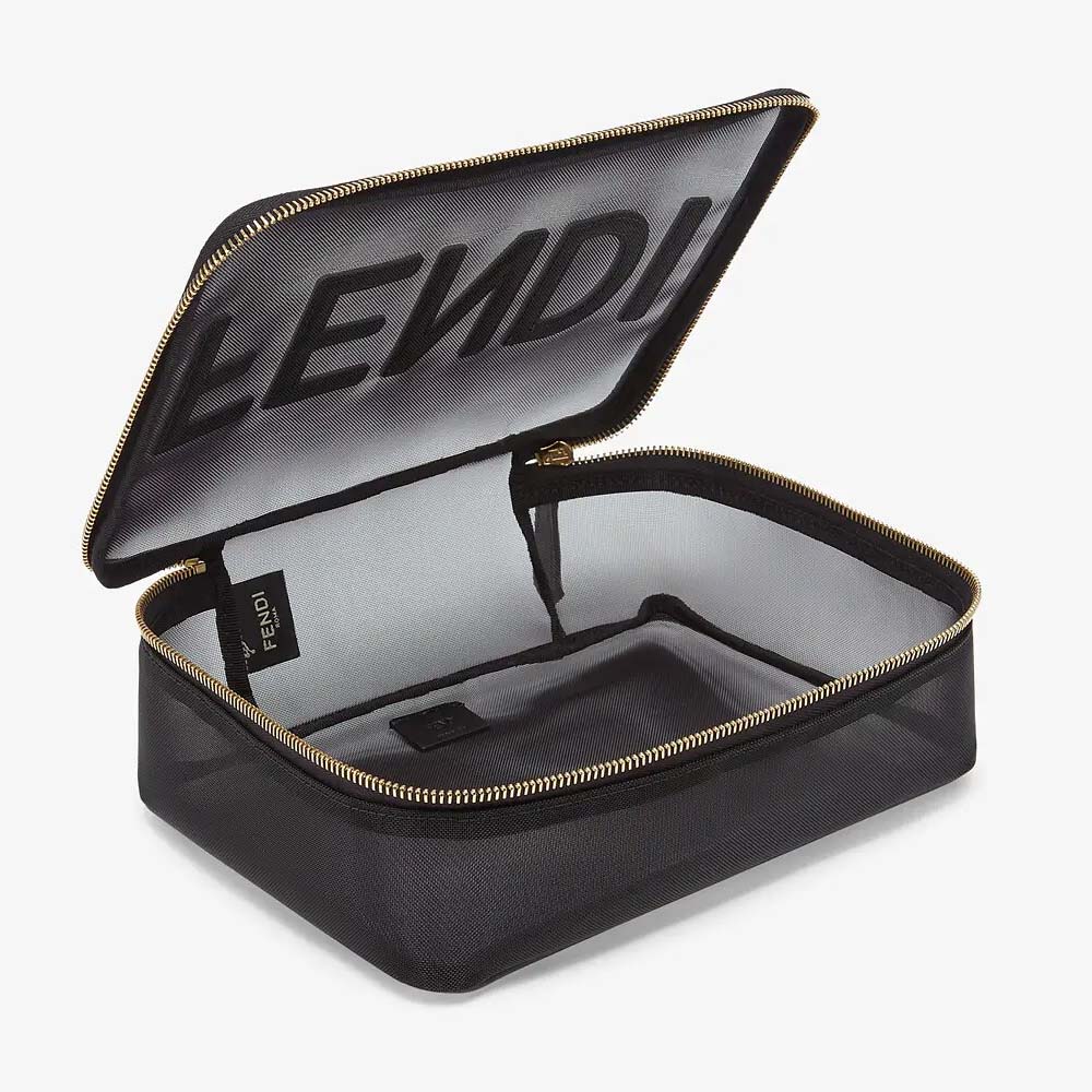 Rectangular travel organiser with zip closure. Made of black micromesh. Embellished with black leather edges and Fendi Roma lettering. Gold-finish metalware.
