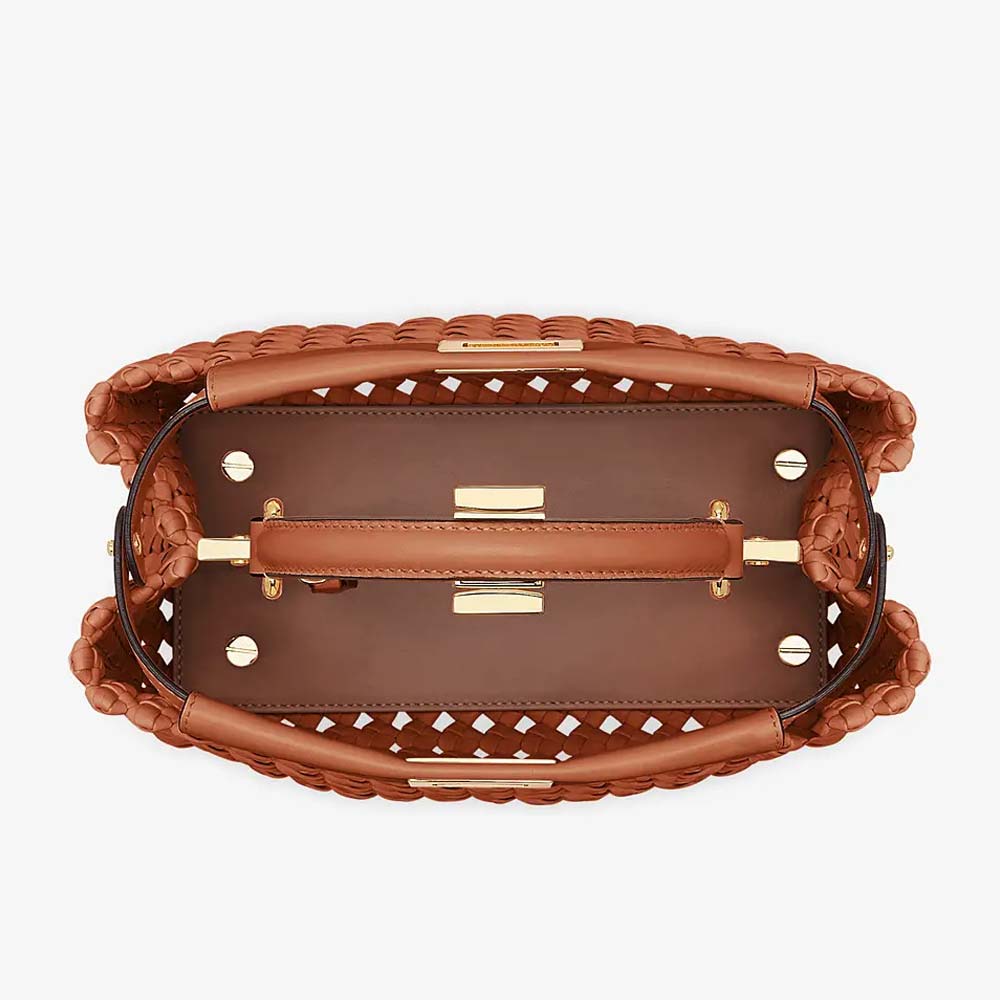 Iconic small Peekaboo bag made of brown woven leather and embellished with the classic twist lock on both sides.