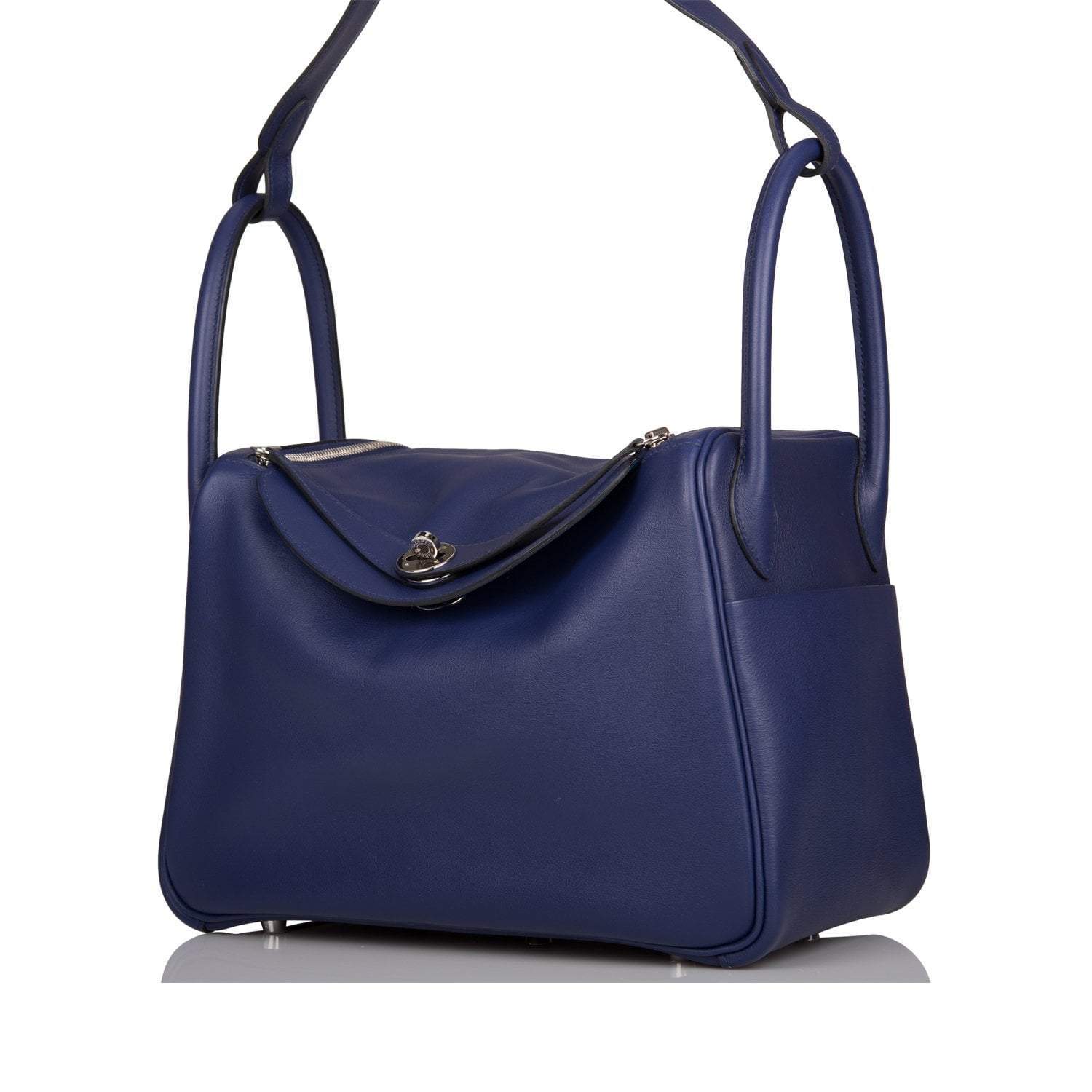 This Lindy is of Bleu Encre swift with palladium hardware and features tonal stitching, double zipper pulls, center Hermes twist lock closure, five palladium feet, and two top handles that are linked by a removable shoulder strap.