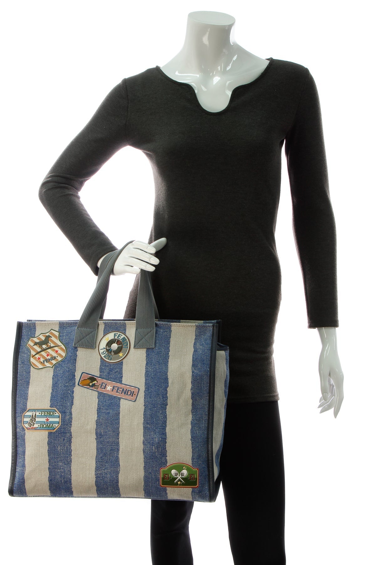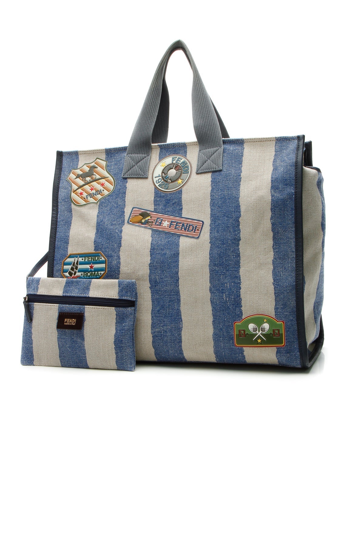 A classic tote for those casual days, this authentic Fendi tote is the sporty companion for days you need to be well prepared. Blue and beige striped canvas is enhanced by sports inspired patches. Whether it’s to a sports game or shopping, this bag carries all that you need and more.