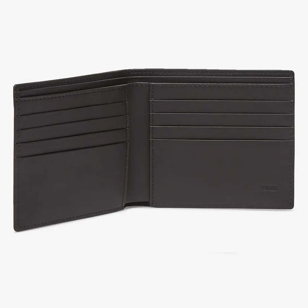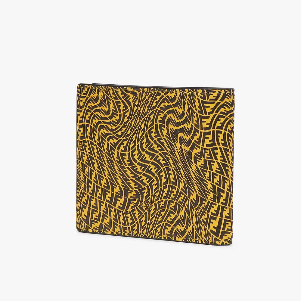Wallet with 8 interior card slots and two compartments for banknotes. Made of yellow leather with FF Vertigo pattern print in black creating a 3D effect. Black leather lining. Palladium-finish metalware.